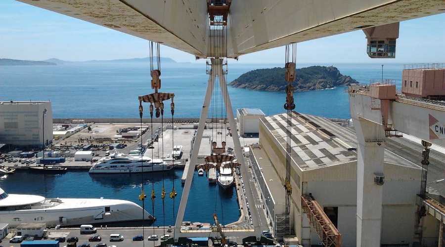 Mise à l'eau d'un yacht aux Chantiers Navals de La Ciotat en juillet 2015 avec le grand portique de levage Krupp 660T.Au 1er juillet 2016, La Semidep-Ciotat/La Ciotat Shipyards regroupe 7 opérateurs principaux : Monaco Marine, Composite Works, Classic Works, H2x, Sailing Concept, Nautech Group et enfin Lürssen (ex Blohm & Voss) se voit confier l'exploitation la grande forme de radoub pendant 35 mois.